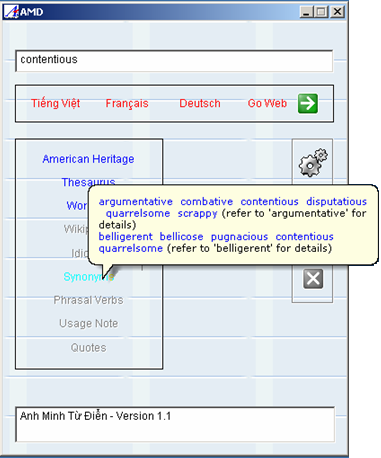 Muốn xem các phần giải thích Anh-Anh của 1 từ tiếng Anh – các phần này gồm có AmericanHeritage, Thesaurus, WordNet – ta có thể dùng các nút tương ứng. Ví dụ nếu muốn xem phần giải thích AmericanHeritage bạn nhấn AmericanHeritage.