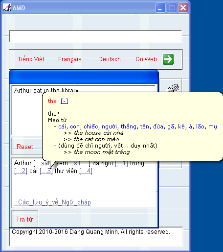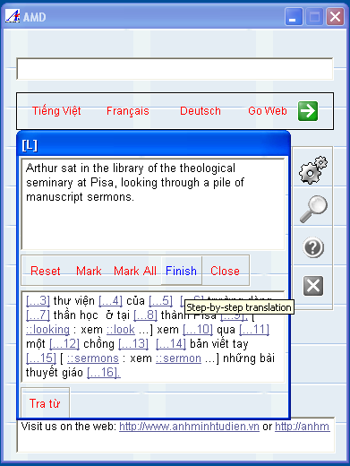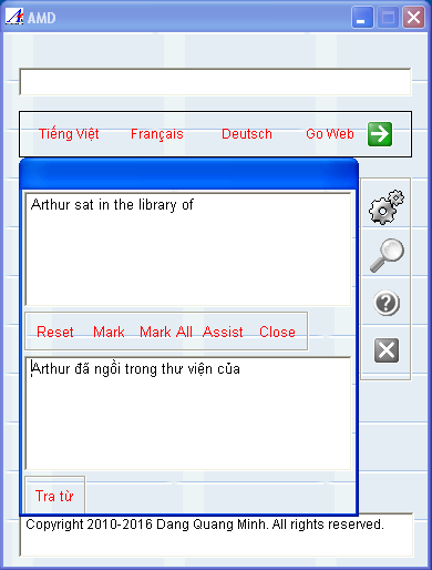 Mở cửa sổ dịch và copy đoạn văn bản hay cả trang sách vào khung. Khi ấn nút “Assist” tiện ích sẽ lần lượt đọc các từ trong đoạn text và mở file Word nếu cần thiết, từ nào đã được tra sẽ được lưu trong bộ nhớ cho các lần tiếp theo. Mỗi khi phân tích xong một câu (hoặc khi đoạn văn đã hết), nút bấm sẽ đổi là “Finish” và một cửa sổ mới được mở ra, ở đây người dùng có thể tự tay chỉnh sửa thêm phần tiếng Việt cho hoàn chỉnh.